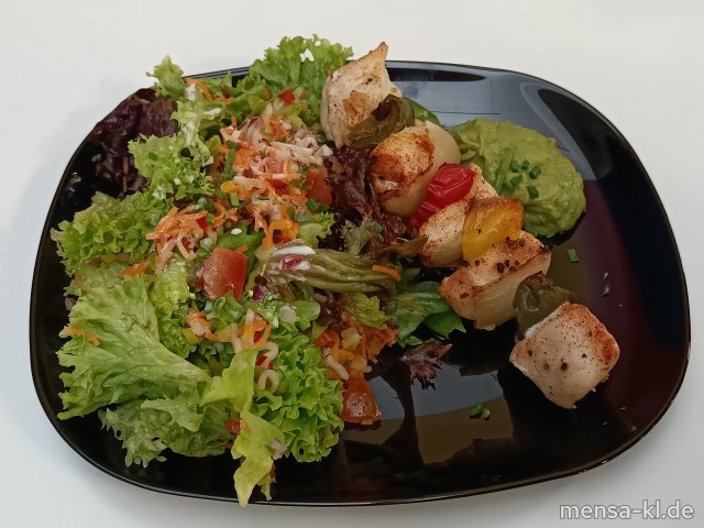 Hähnchenbrust-Spieß Mango-Mole, Zitrus-Limetten-Lachs-Spieß, Tofu-Miso-Mare-Spieß, Halloumi-Ananas-Spieß, Pfannengemüse, verschiedene Dips, Salate, Vollkornreis und Gourmet Gerste