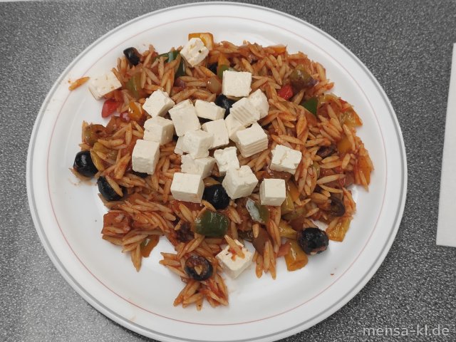 Gebackener griechischer Hirtenkäse mit Pusztasoße, bunter Reis und Salat