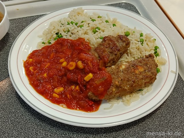 Cevapcici mit Pusztasoße, bunter Reis und Salat