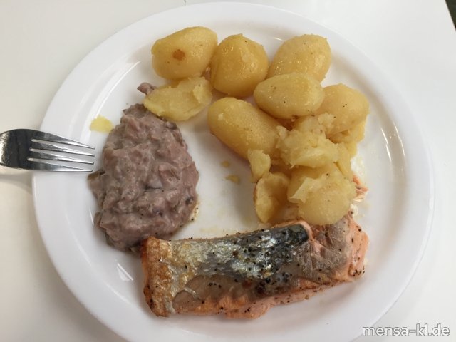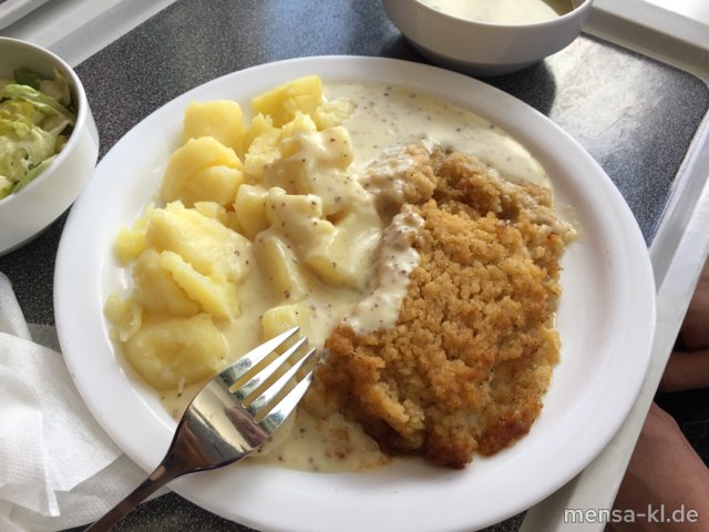 Gebackenes Seelachsfilet mit Remoulade, Petersilienkartoffeln und Salat