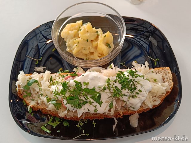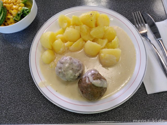 Maultaschen mit Fleischfüllung mit Kartoffel-Käse-Soße und Salat