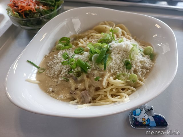 Spaghetti Carbonara mit Käsesoße, dazu Salat