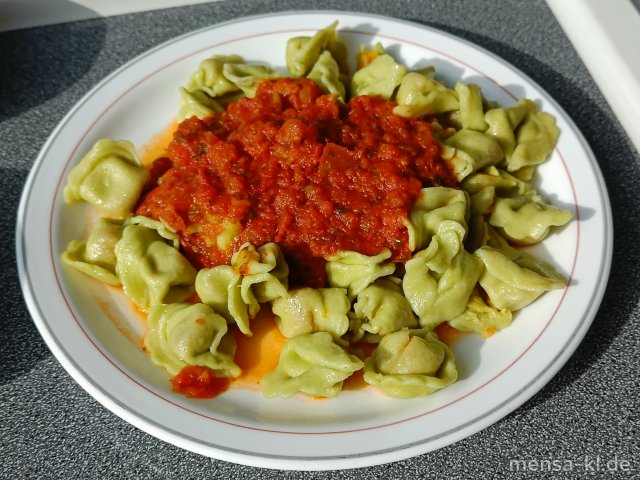 Tortellini mit Gemüsefüllung, Käse-Sahnesoße und Salat