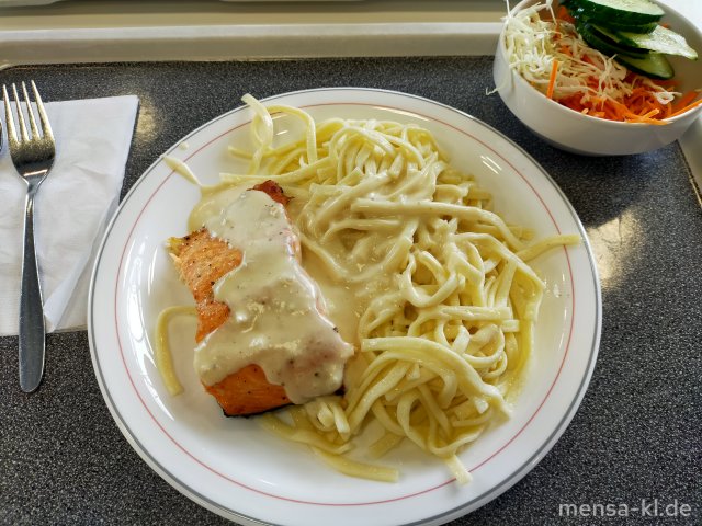 Gemüsenudeln mit Räucherlachssoße und Salat