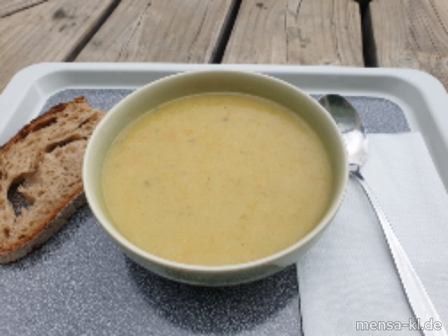 Gemüsecremesuppe, dazu eine Scheibe Brot