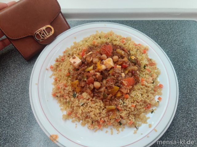 PLant Hackrolle Tomate mit Zwiebel-Granatapfelsoße, Couscous und Salat