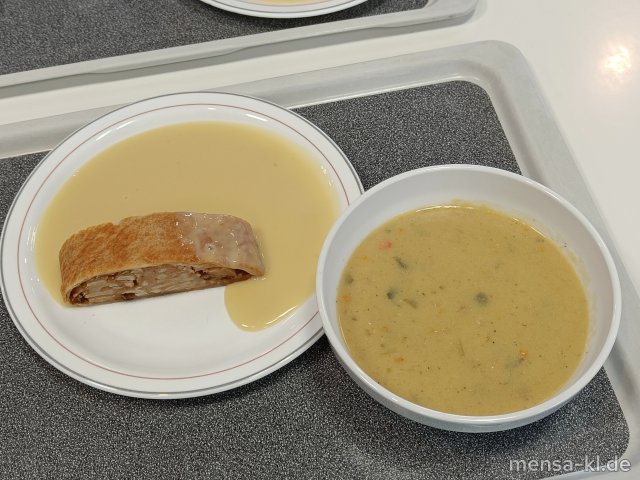Kürbissuppe mit einem Stück Apfelstrudel, vegane Vanillesoße und einem Kürbisbrötchen
